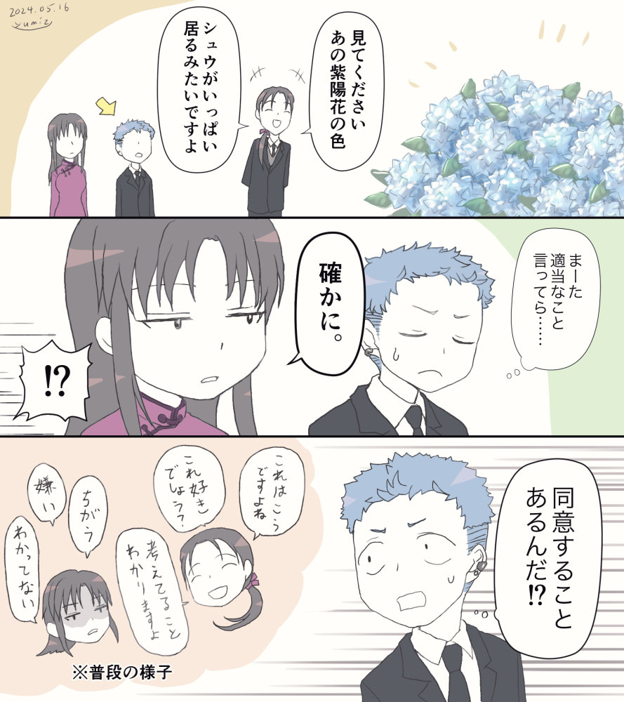 去年の梅雨時に描きかけてて1年経っちゃったやつを仕上げました。シュウをいじる時だけごく稀にワンフェイに同意することがある翔。そういえばと思って探してみたら前も言ってたけど翔(167cm)がヒール履いてる時はシュウ(169cm)より背が高いです。