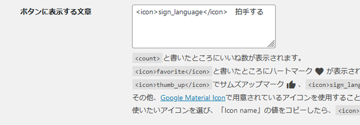 初期設定だとボタン内にボタンが押された数が表示されるようになっていて、これを非表示にしたいが設定項目が見当たらない……と思ったら「いいねボタン」→「ボタンデザイン」ページの「ボタンに表示する文章」のところに書いてありました。