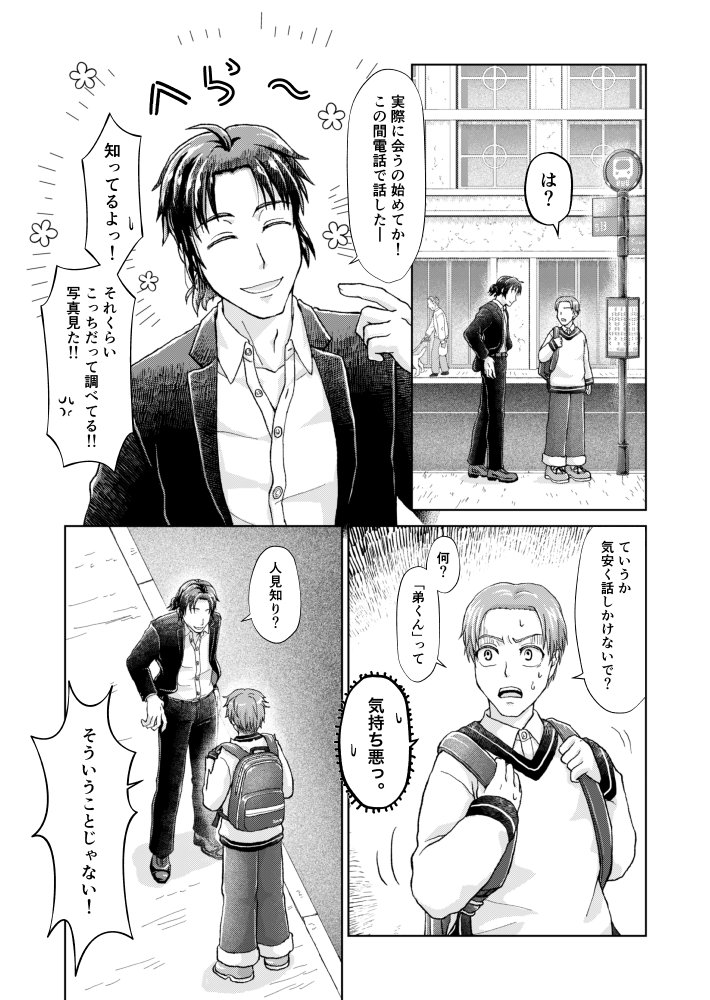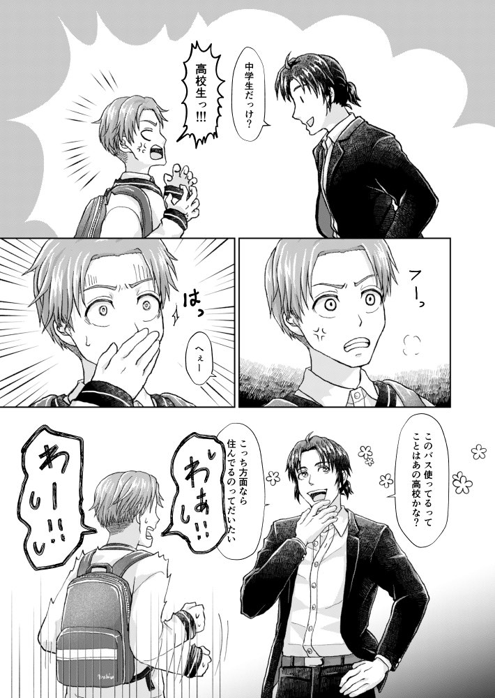 アルフにきゃんきゃん吠える成が描きたくて描きました。アルフは罵倒耐性が高いので成から気持ち悪がられても全然ヘラヘラしていられるが、に言われたらしばらく落ち込むと思う。ちなみにこれは本当に偶然ばったり会っただけなのでアルフには本当に悪意はないのだけど、軽率に「個人情報漏らしたら特定しちゃうぞ😉」みたいな冗談をかますから信用されない。実際前回特定しちゃってるから冗談になってない。成も脇が甘いのだけど、未成年相手にそういうことやる大人がダメですわの気持ちで描いてます。