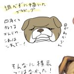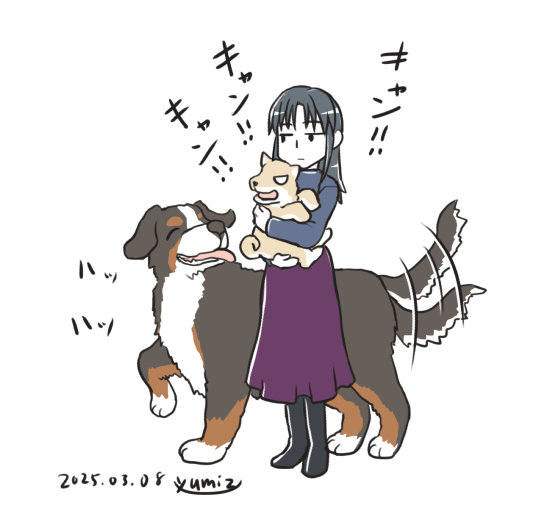 翔に抱っこされながらキャンキャン吠えている犬化した成と足元でわふわふしている犬化したアルフ