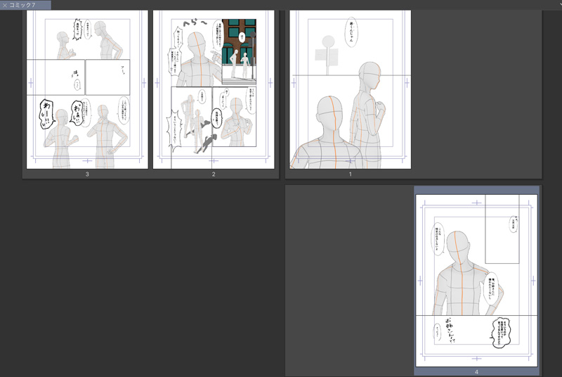 バス停はBlenderで自作したもの、2P目1コマ目のビルは素材をアタリに利用しました。