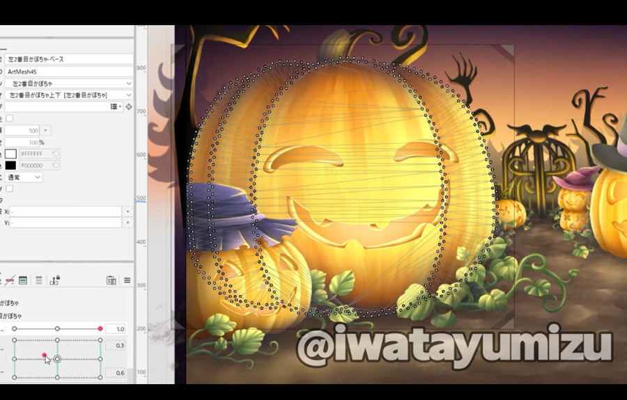 でもすっごい動いてる感あるけど前回のブーゲンビリア背景よりはやってることシンプルなので手間はあっちよりかかってないんですよねぇ。ブーゲンビリアは植物のパーツ分け細かくやったからモデリング時に「これどこ!?何!どれだったけ?ねぇ!どれ!!?」ってなってたから……今回はその反省も踏まえて原画のレイヤーとパラメーターは分かりやすい名前付けを心がけたので混乱少なめだったというのあるかな~。ちゃんと成長している……!!あとキャラクターモデリング、できそうな気がしてきた……ショップの看板キャラを作りたい意思はある。