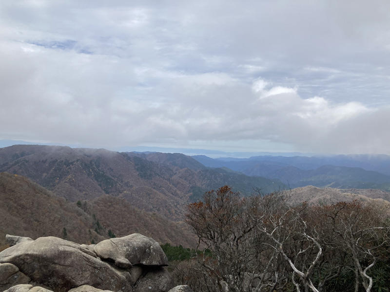 山頂からすぐのところに琵琶湖が見える場所というか岩場があって、この写真の奥のほうに見えるのが琵琶湖です。天気がぎりぎりだったな~もうちょっと雲出てきたら琵琶湖見えんかった。